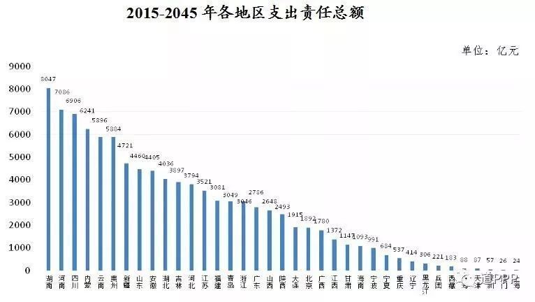從地區(qū)分布看,中西部地區(qū)支出壓力較大。2015-2045年間,支出責(zé)任總額前五位的分別為湖南8047億元、河南7086億元、四川6906億元、內(nèi)蒙古6241億元和云南5896億元,年均支出分別為260億元、229億元、222億元、201億元和190億元,分別占2017年本省一般公共預(yù)算支出的3.8%、3.1%、2.6%、4.4%和3.3%。
